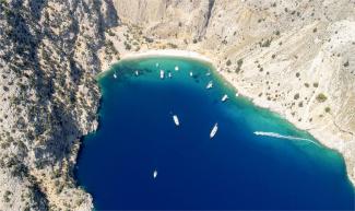 One of the best-kept secrets of Symi, Agios Georgios is a beach with access only from the sea on the east side of the island. Crystal-clear blue waters and a dreamy sandy beach in the shadow of the steep cliffs invite you to endless dives of coolness and summer fun, surrounded by a landscape that magnetizes with its wild natural beauty.